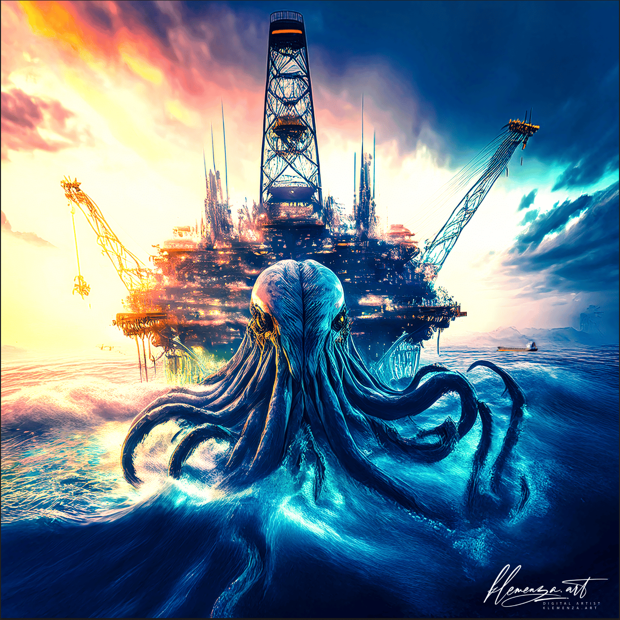 In this piece, we see a hungry predator reconnoitering a modern oil platform. It doesn't see "technology"—it sees an intruder in its ancient territory. It has plenty of arms to choose its next move. Will it attack, or is it just curious about this strange, steel "colony of fish"?