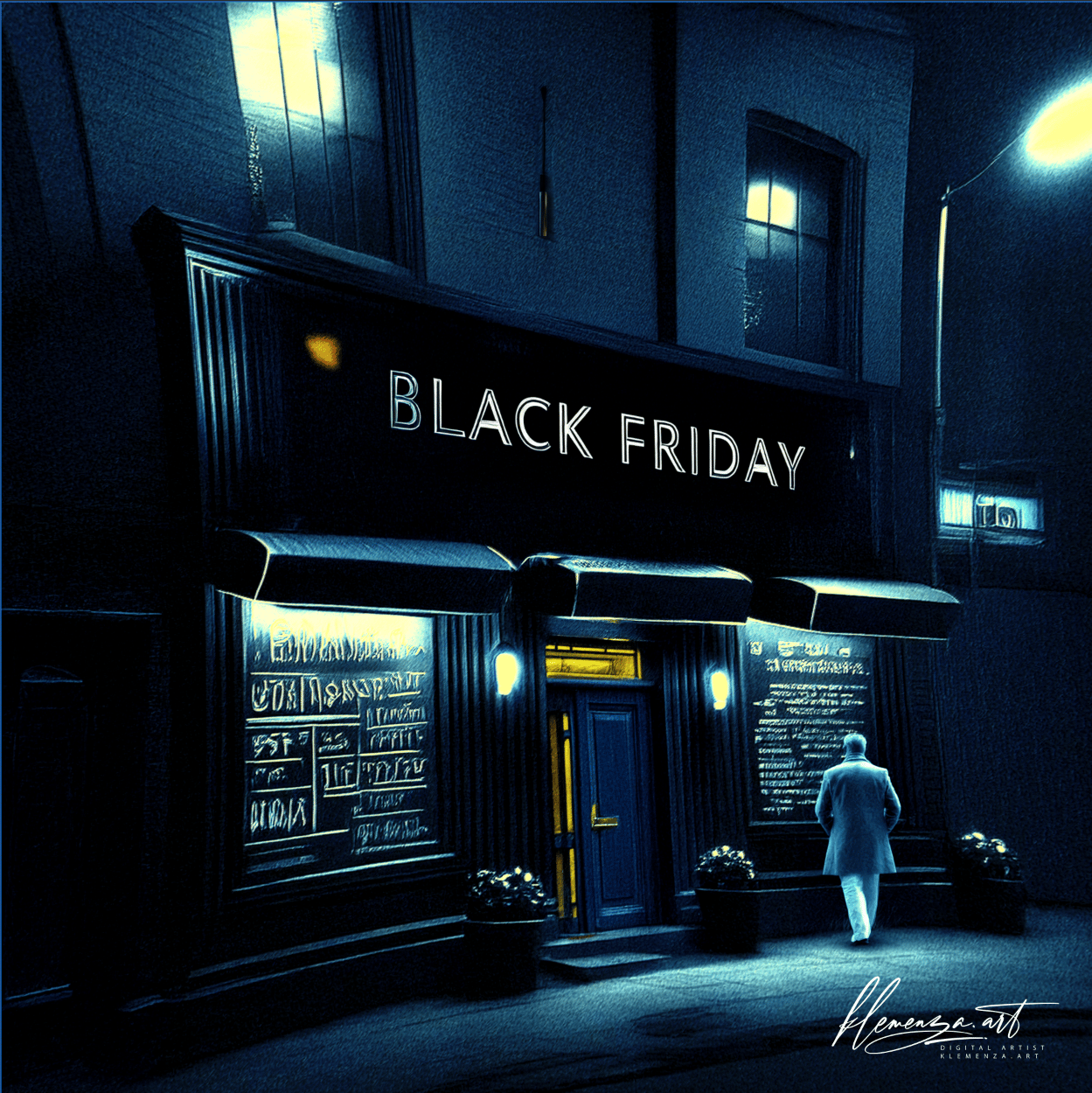 Imagine a dimly lit alley in Manchester, UK, at night, where a shadowy figure walks away from a mysterious shop/bar/pub labeled "BLACK FRIDAY"—its windows etched with ancient symbols, casting a defiant glow on the brick walls. It's a haunting tribute to those who embrace the unconventional, turning societal fringes into a beacon of bold self-expression.Bravo!!!