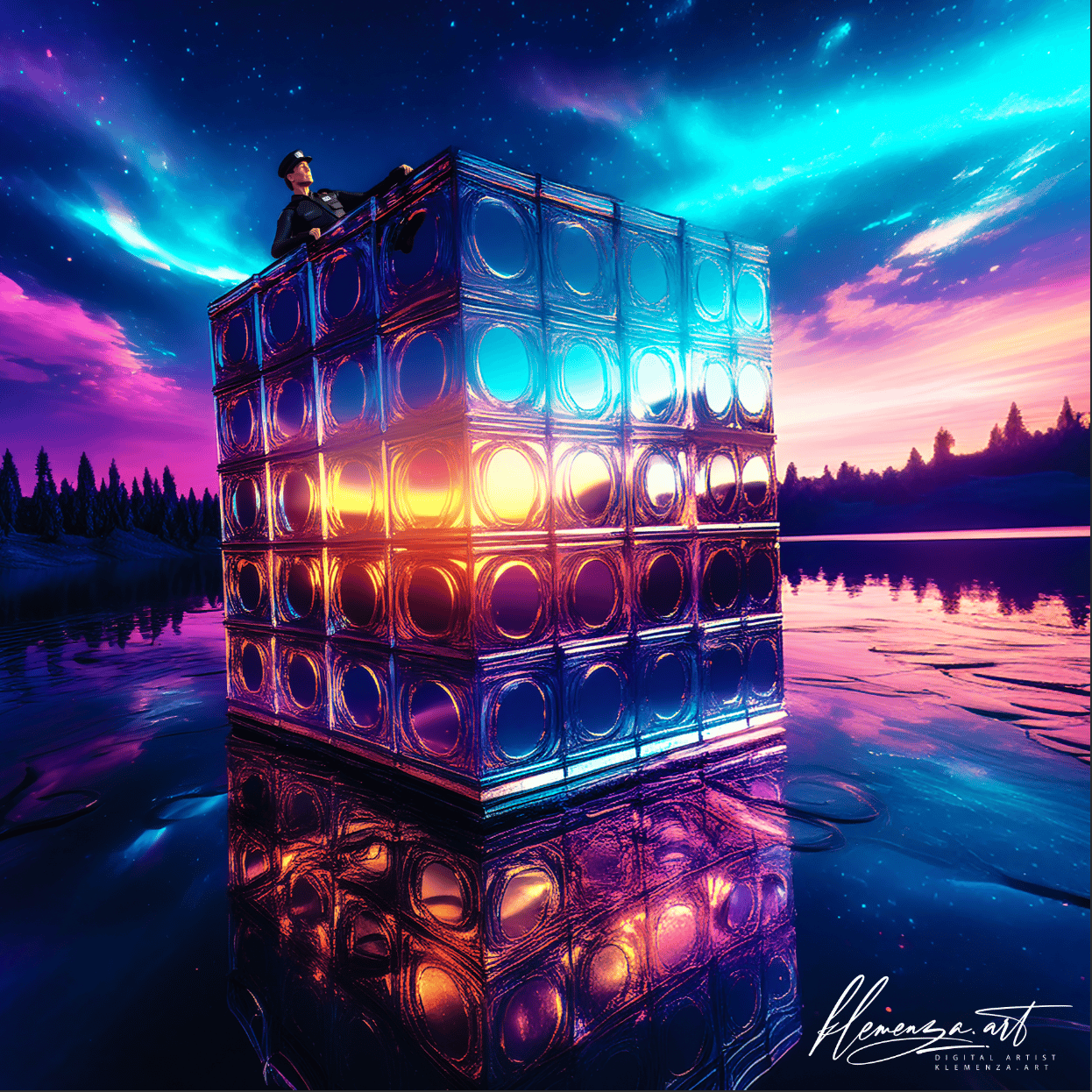 A splendid phantasmagoria of polished geometry and luminous delirium. CUBE DUDE features the officer Rubiics atop a cathedral of reason—a 15,000-pixel monolith reflecting a sky that is not weather, but pure emotion. It is a Daliesque meditation on mirrored rationality and the spectacle of consciousness.