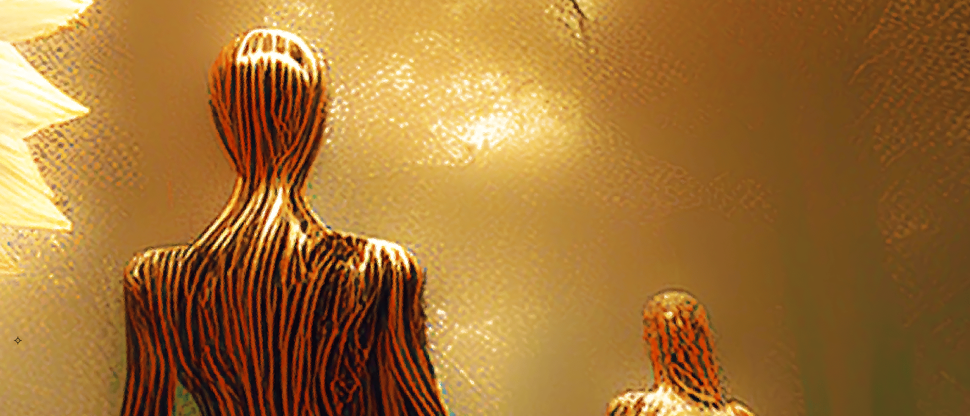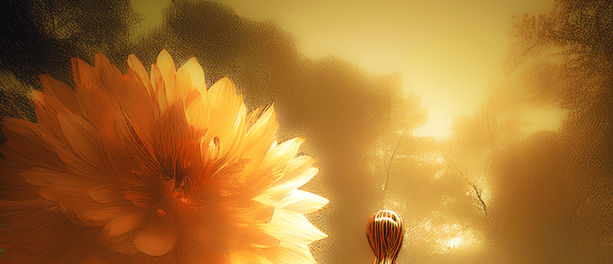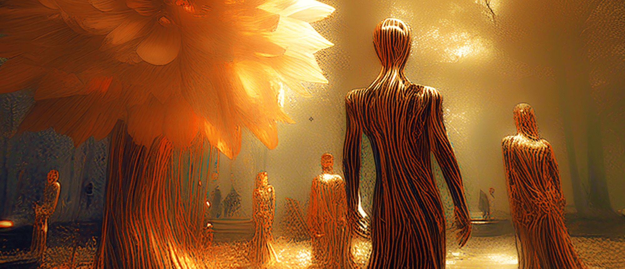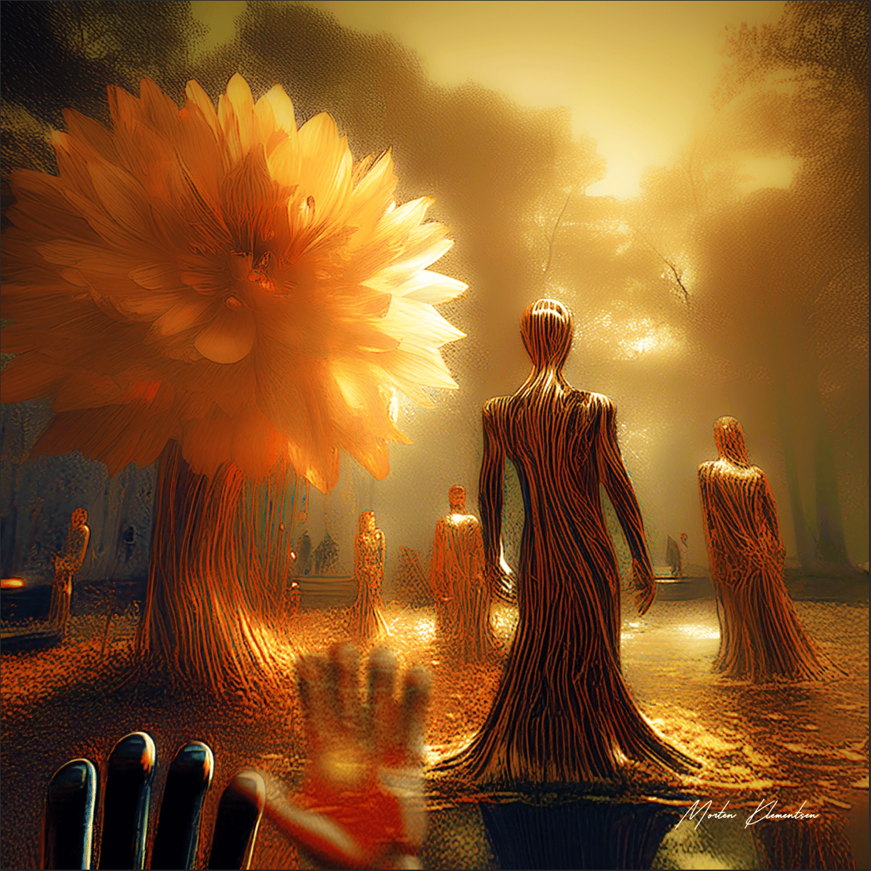 With golden hues and mist-softened forms, the piece evokes a sense of reverence for the invisible. Humanoid figures made of wood and light blend into an atmosphere of quiet transcendence. A luminous flower anchors the composition, a metaphor for life’s fragile beauty amidst impermanence.