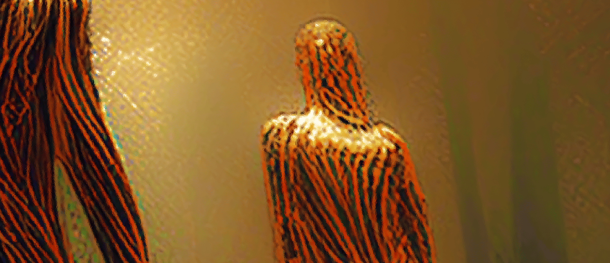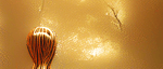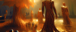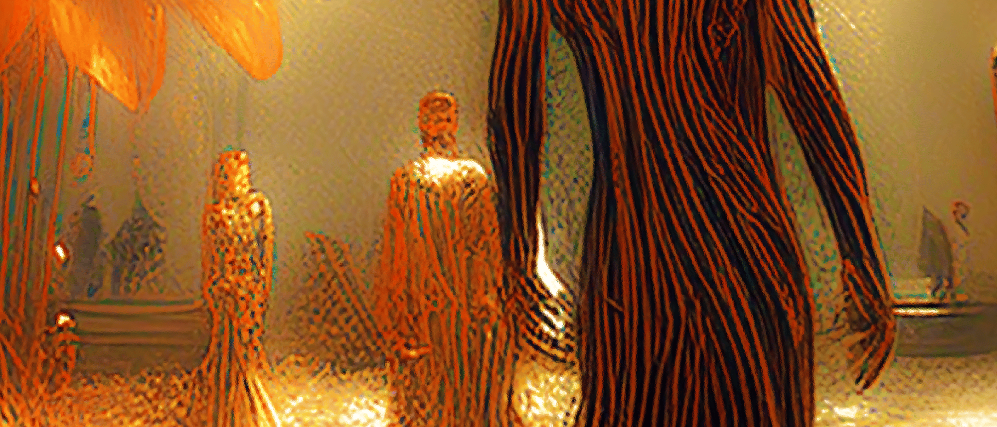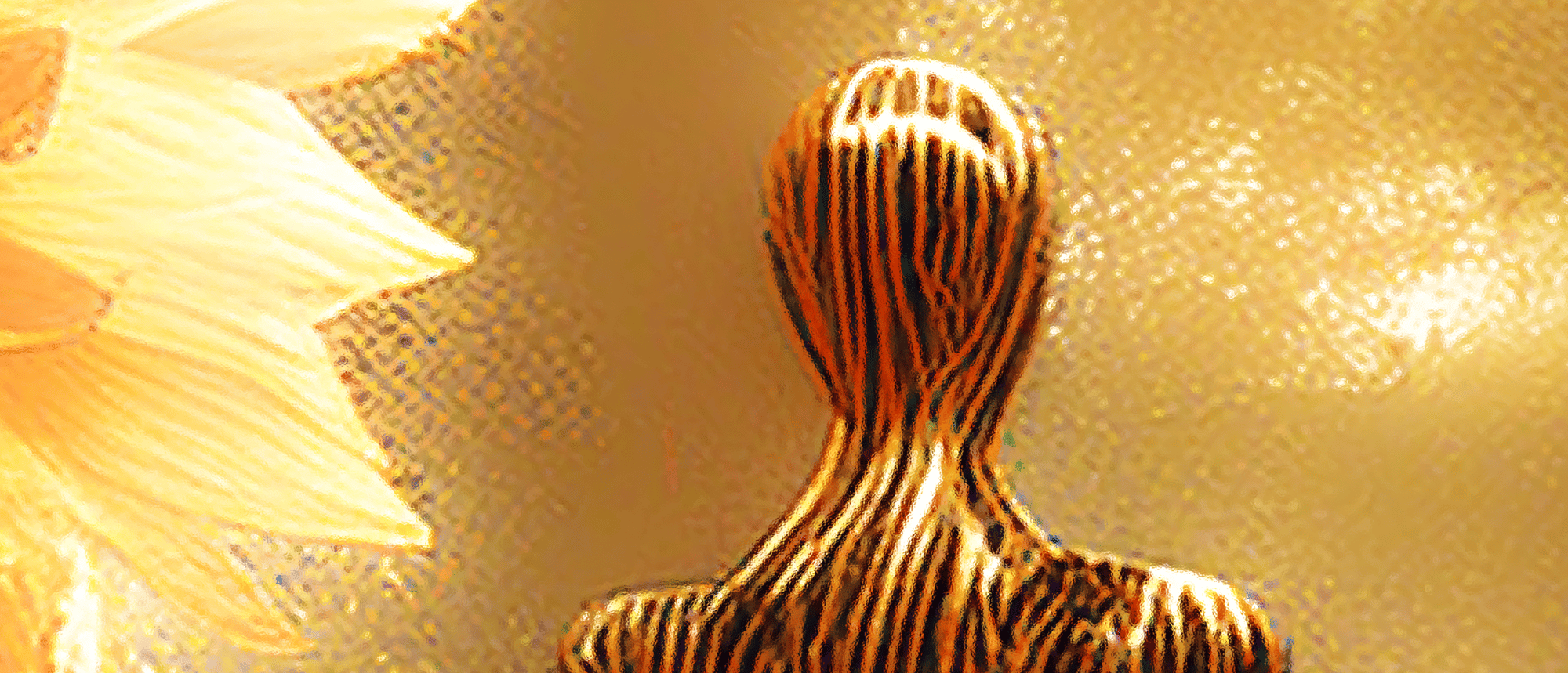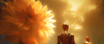 With golden hues and mist-softened forms, the piece evokes a sense of reverence for the invisible. Humanoid figures made of wood and light blend into an atmosphere of quiet transcendence. A luminous flower anchors the composition, a metaphor for life’s fragile beauty amidst impermanence.