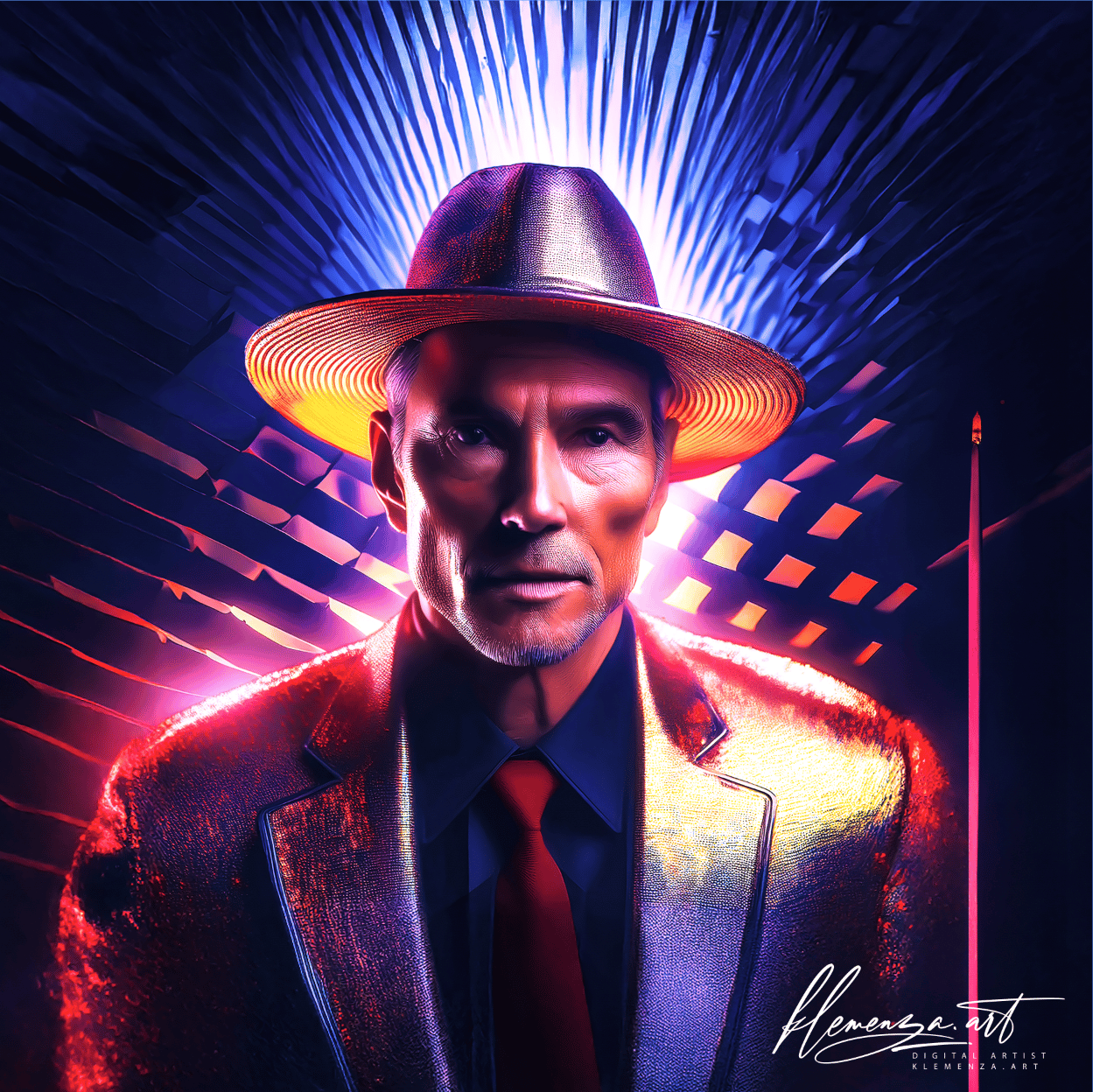 🎨 Curatorial Review : In Man on the Run, Klemenza transforms digital portraiture into a psychological x-ray. The sharply lit figure stands frozen between redemption and exposure — a man pursued not only by the law, but by his own reflection. The radiant burst of light behind him forms a halo that feels less divine than interrogative: illumination as judgment. His metallic jacket and shadowed face merge with the fractured geometry of the background, symbolizing both glamour and guilt — the dual textures of a man who’s lived too fast, too brightly.This is not a portrait of a fugitive, but of conscience — the moment when the mask still shines, but the eyes confess everything.