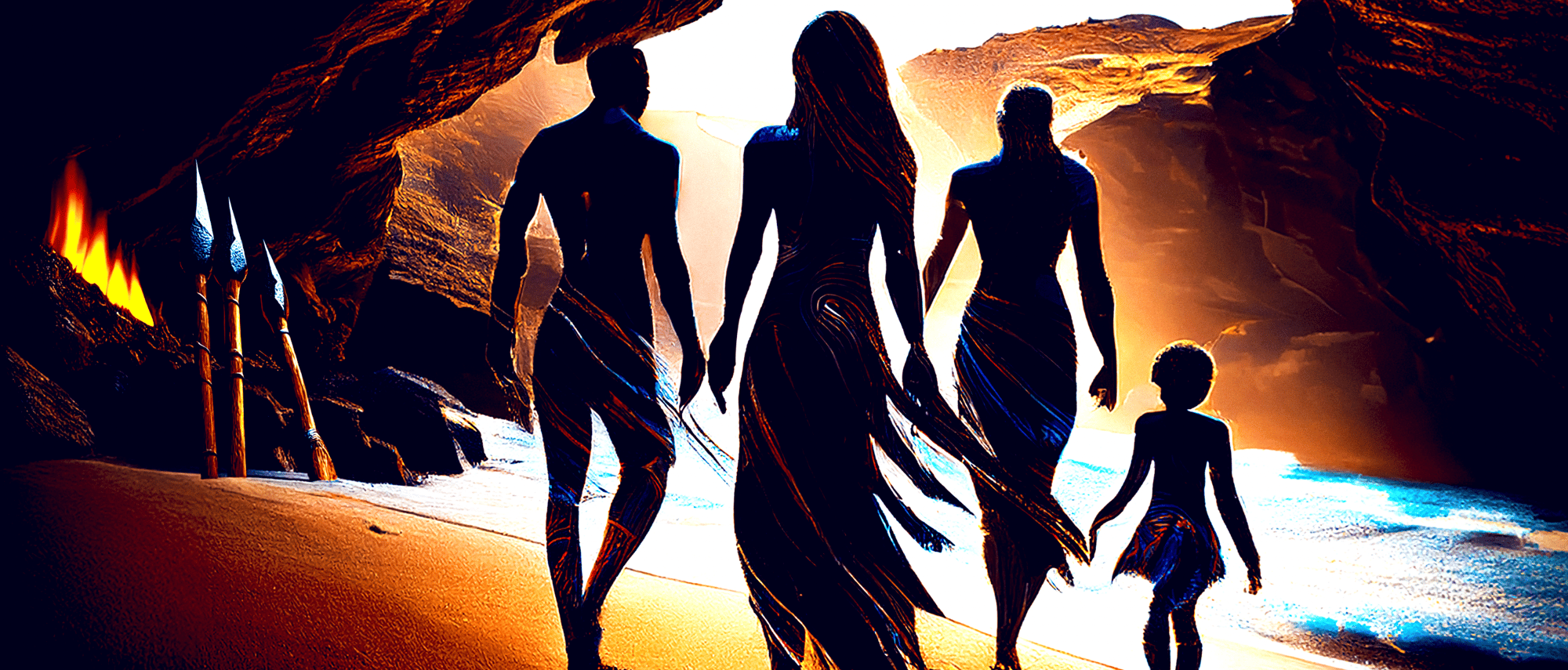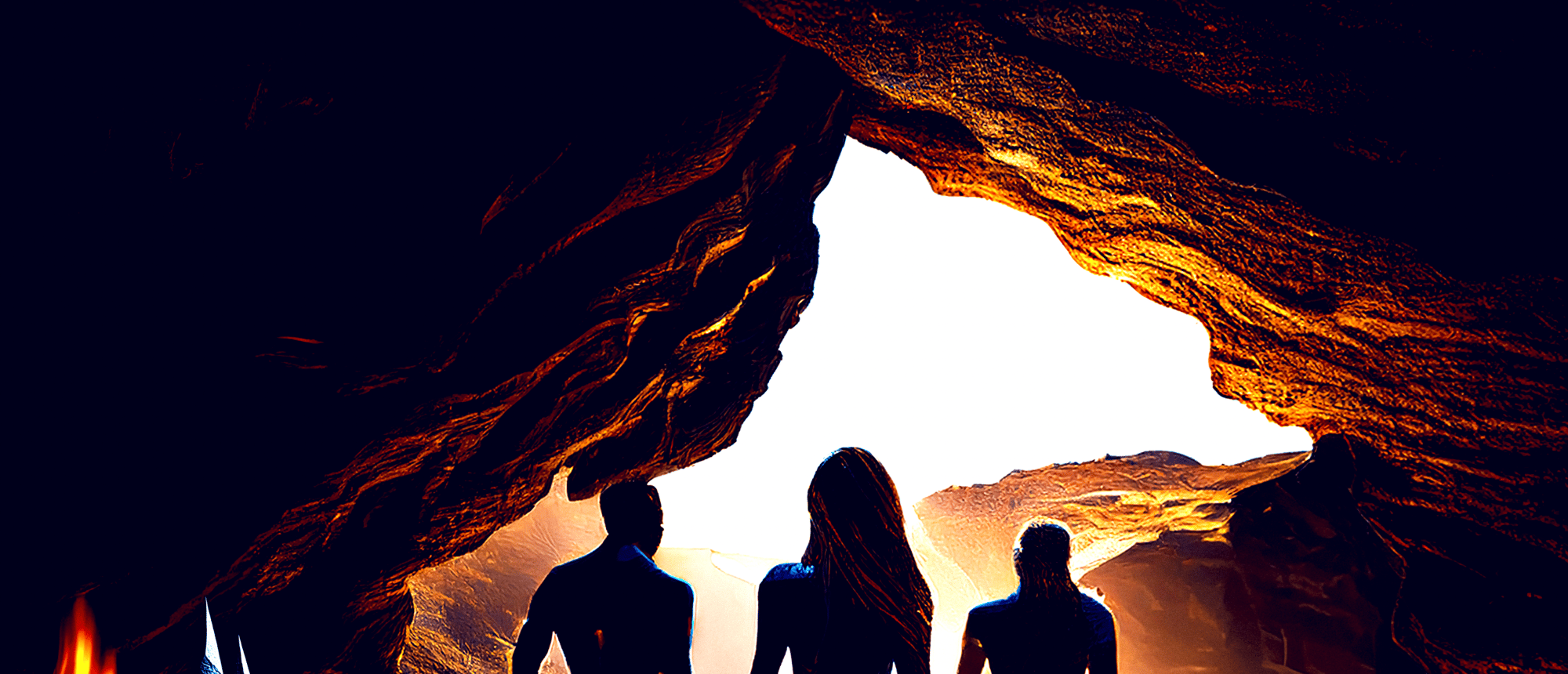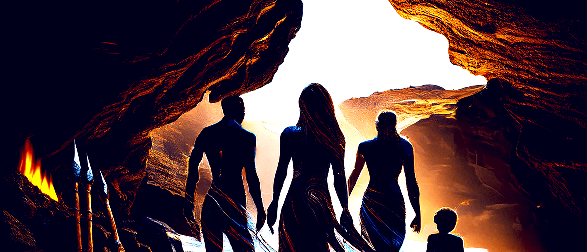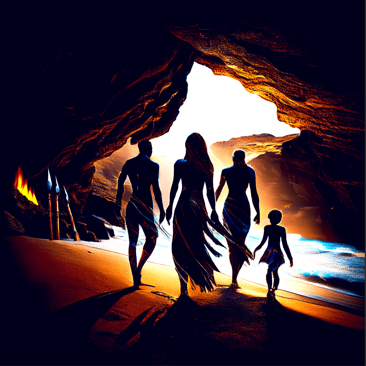 "Step into the story of survival and discovery with this evocative piece of digital art, inspired by humanity’s early evolution. This artwork encapsulates the moment of transition from darkness to light, symbolizing not just physical escape from the cave, but a deeper metaphor for hope, growth, and human unity. A family – united by survival, courage, and love – faces the unknown with their eyes on the bright light outside. A reminder of the timeless journey from ignorance to enlightenment, from struggle to progress. Own a piece of history today."