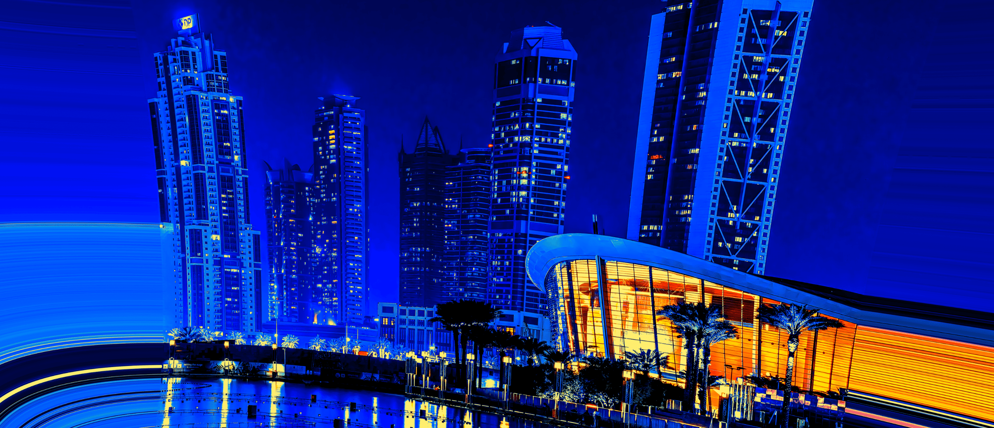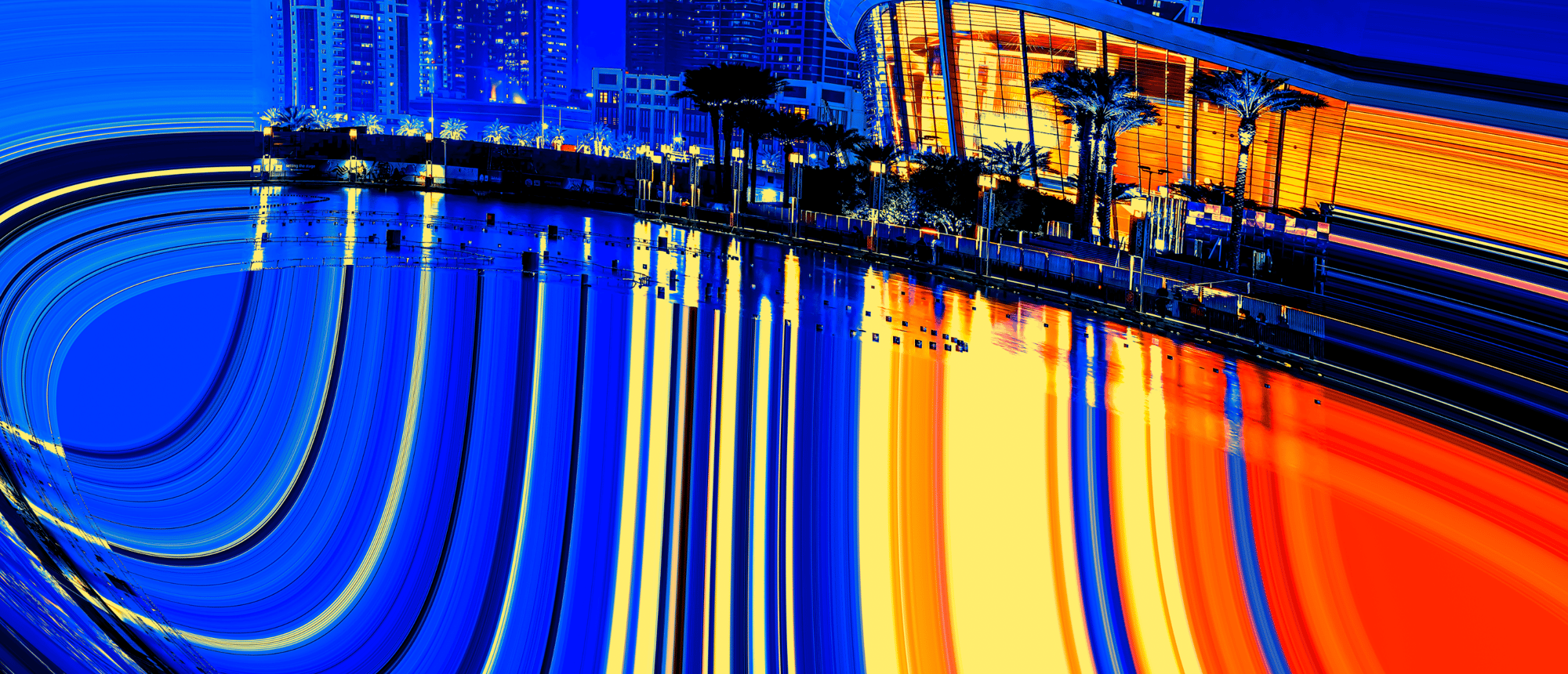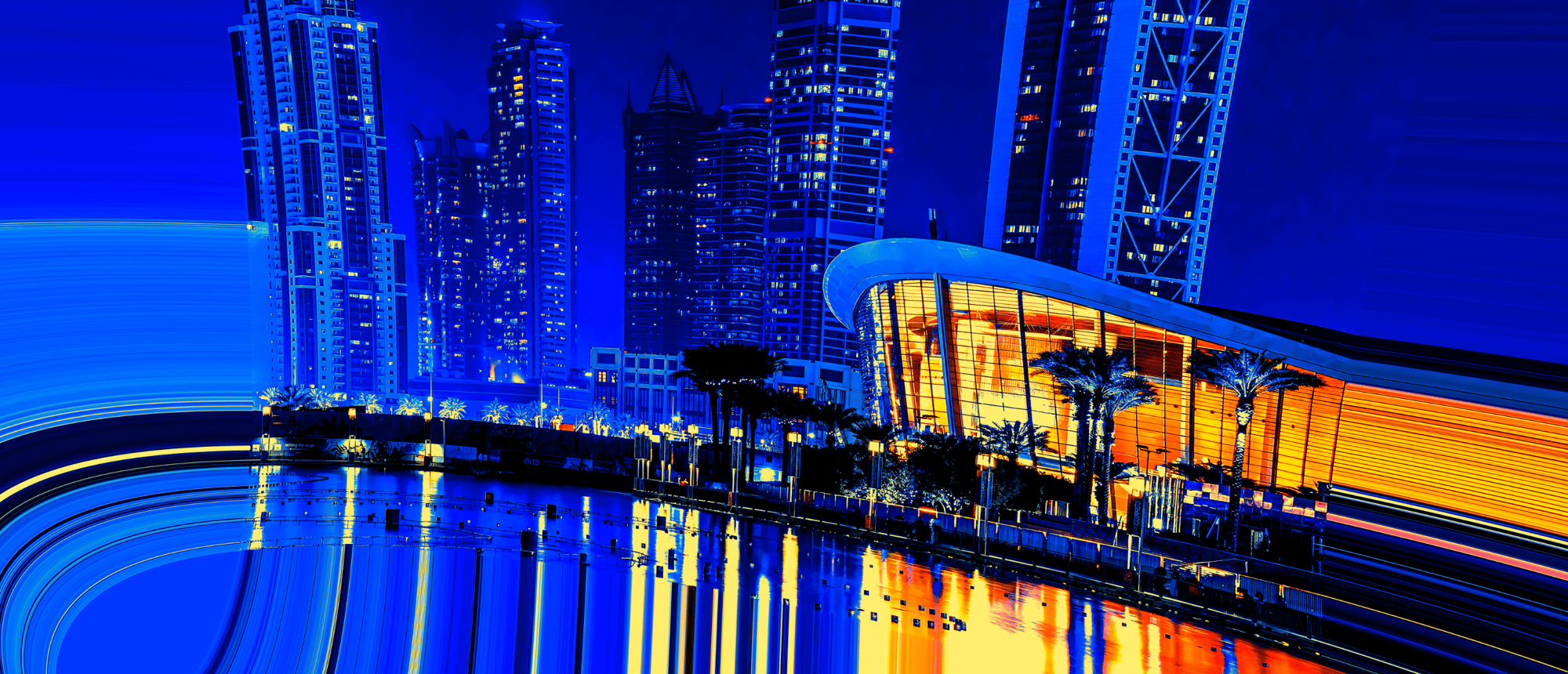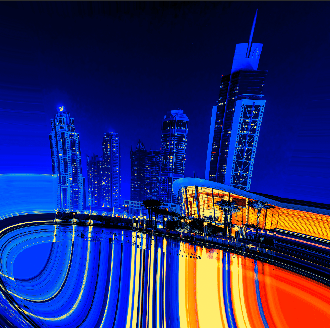 As you gaze at the radiant skyline, illuminated in dazzling shades of blue and vibrant orange, envision the immense forces converging below. Each building tells a story of innovation, standing tall against the backdrop of nature's powerful influence. The curved architecture, framed by swaying palm trees, adds a touch of tropical elegance, marrying the urban with the organic. 🌴💫
