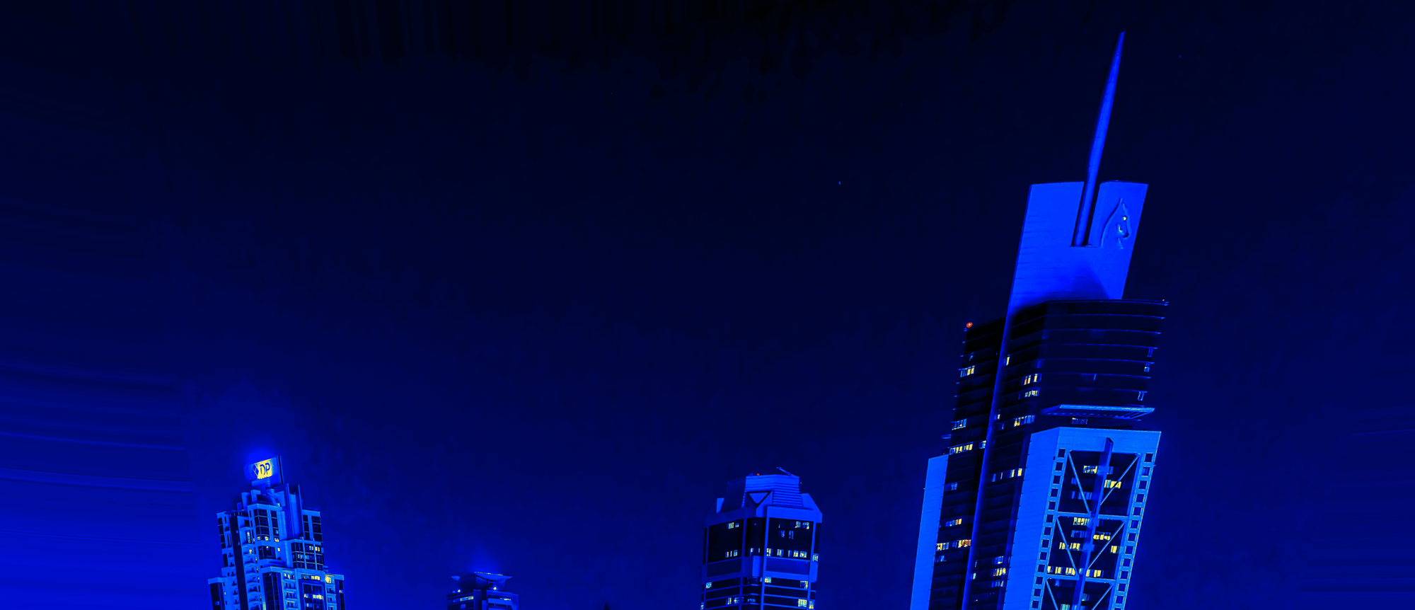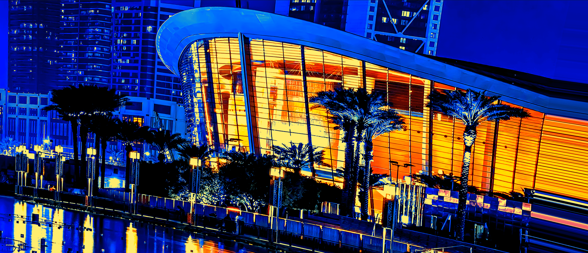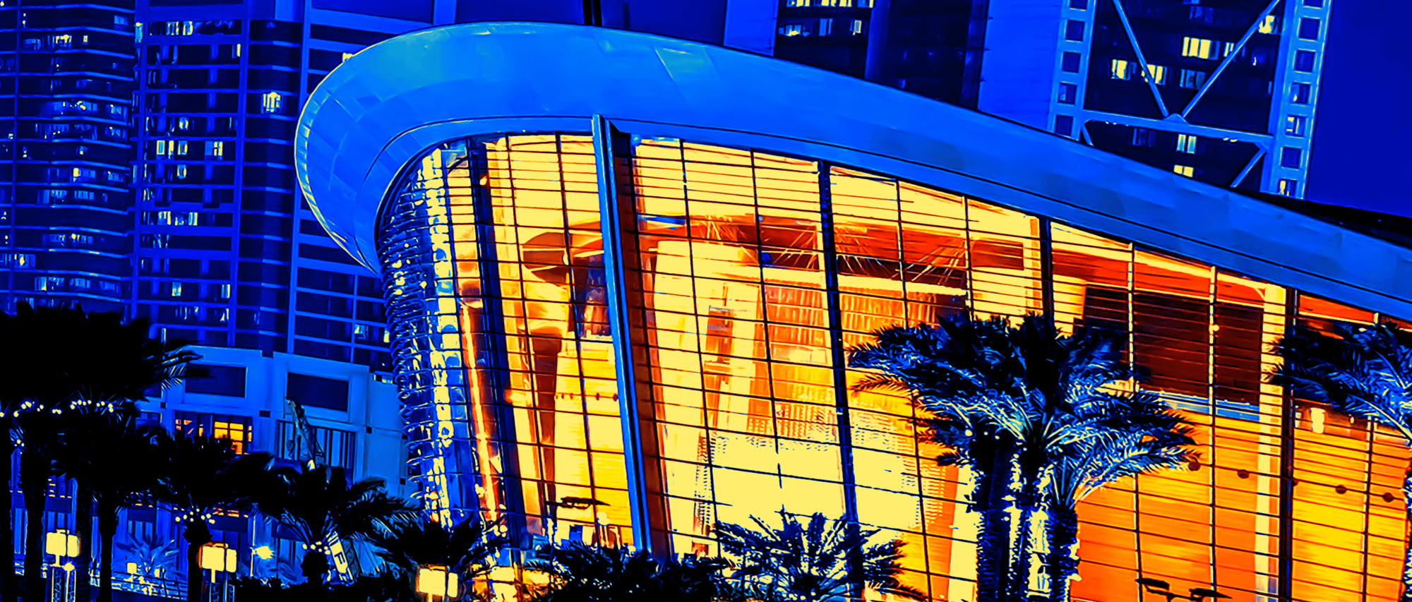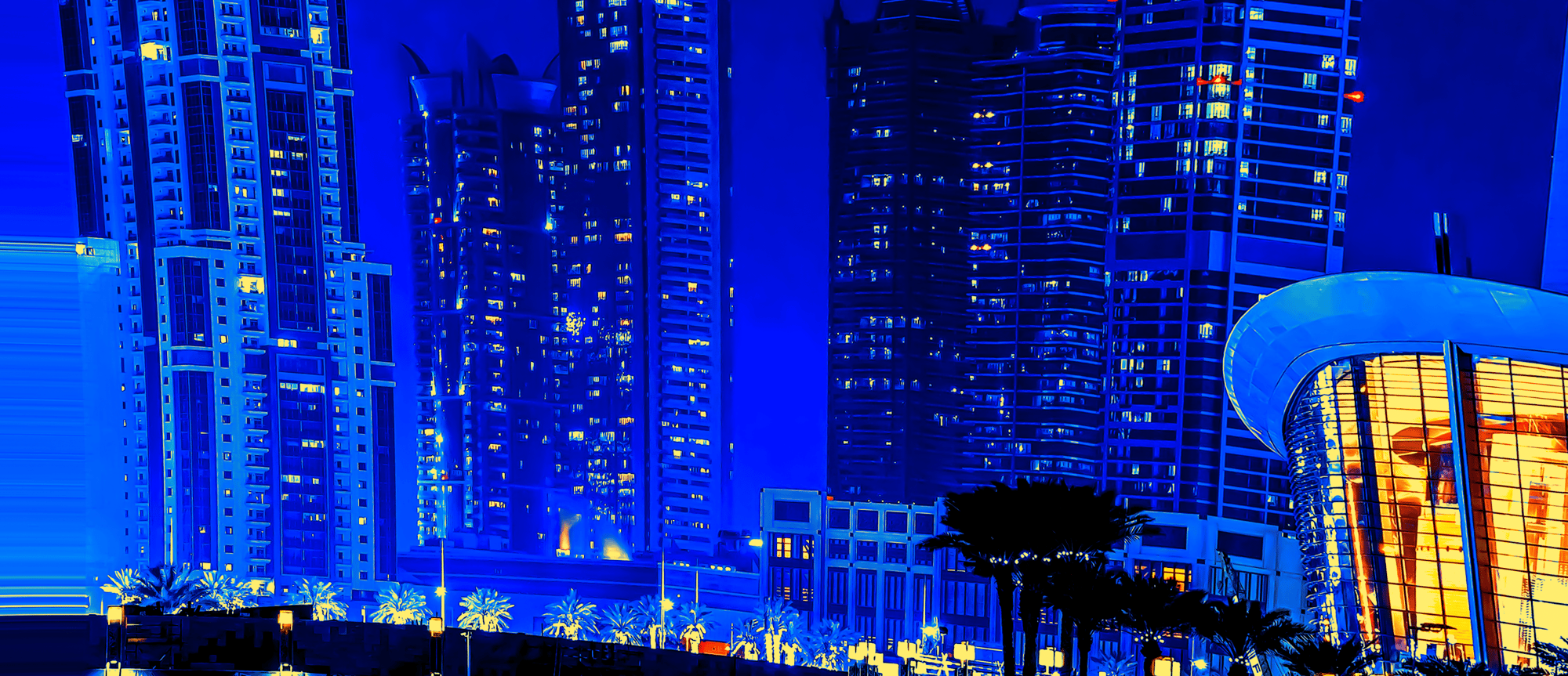 As you gaze at the radiant skyline, illuminated in dazzling shades of blue and vibrant orange, envision the immense forces converging below. Each building tells a story of innovation, standing tall against the backdrop of nature's powerful influence. The curved architecture, framed by swaying palm trees, adds a touch of tropical elegance, marrying the urban with the organic. 🌴💫