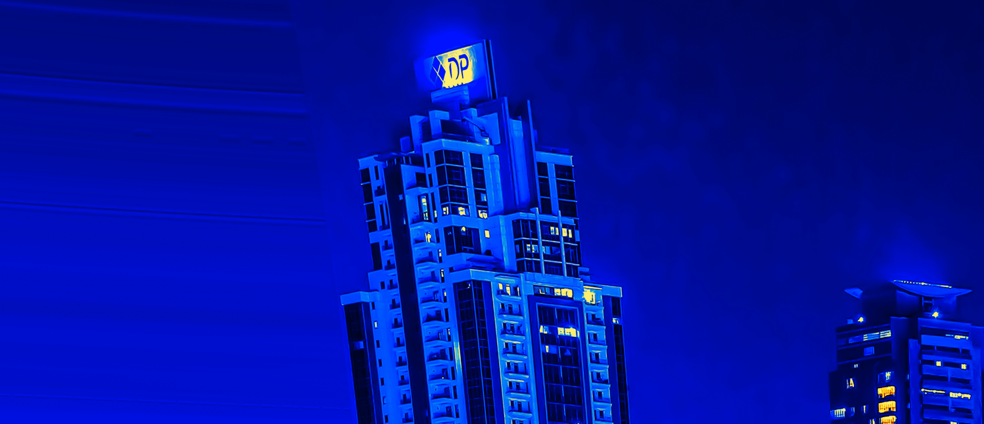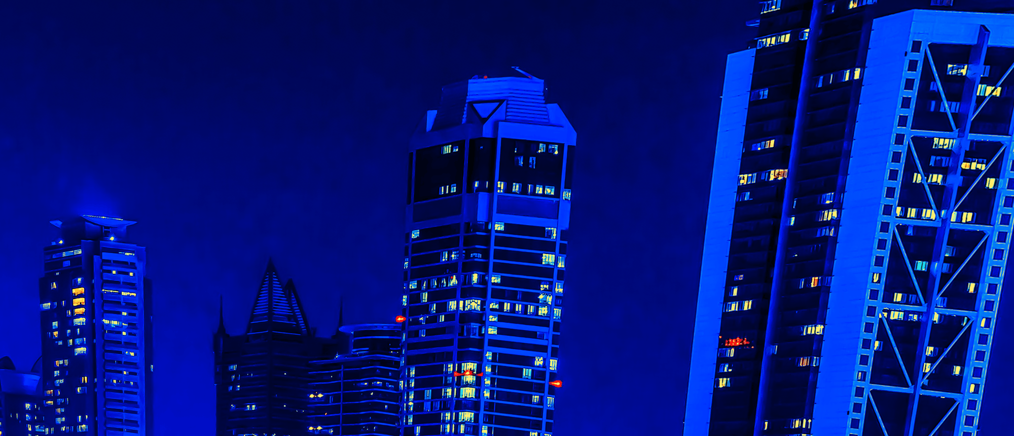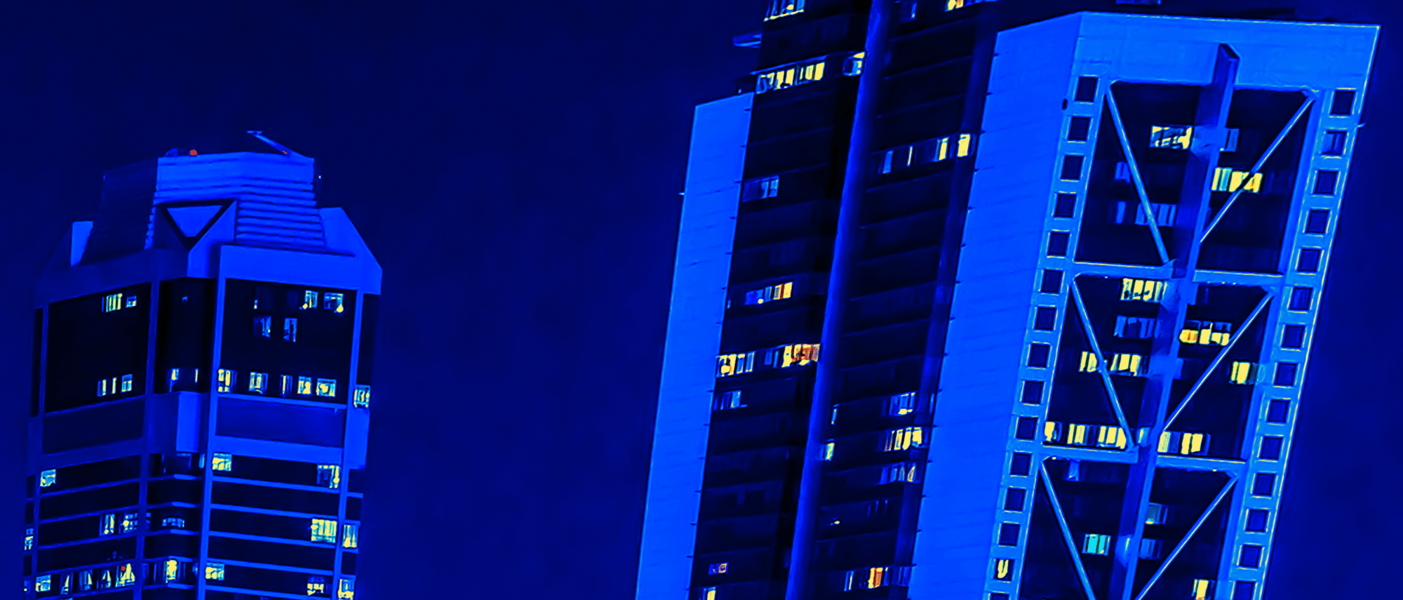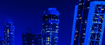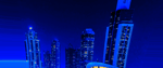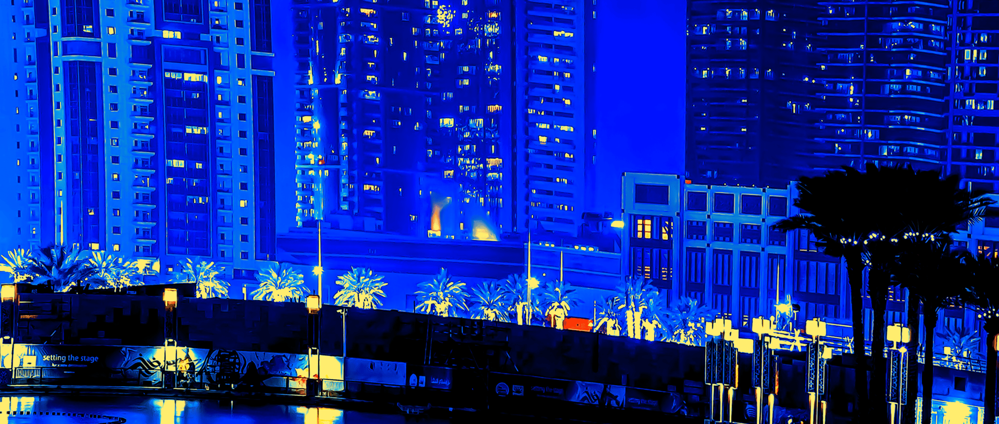 As you gaze at the radiant skyline, illuminated in dazzling shades of blue and vibrant orange, envision the immense forces converging below. Each building tells a story of innovation, standing tall against the backdrop of nature's powerful influence. The curved architecture, framed by swaying palm trees, adds a touch of tropical elegance, marrying the urban with the organic. 🌴💫