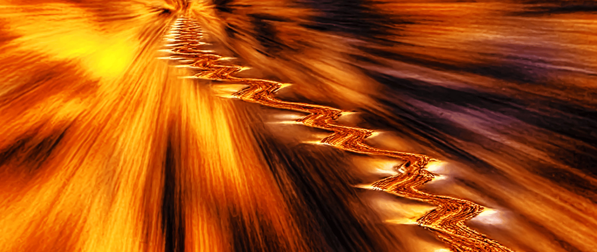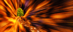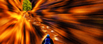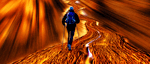 The background explodes with a vortex of golden and blue hues, as though the very fabric of space and time were being peeled back or stretched to reveal the hidden machinery of the universe. This relentless radial blur sucks the viewer into an unsettling vortex, conjuring the sensation of slipping into a waking dream or the depths of memory distorted by the passage of time. It is as if the traveler moves not on earth but through a temporal portal, each step reverberating with the echoes of forgotten future and past selves.