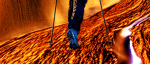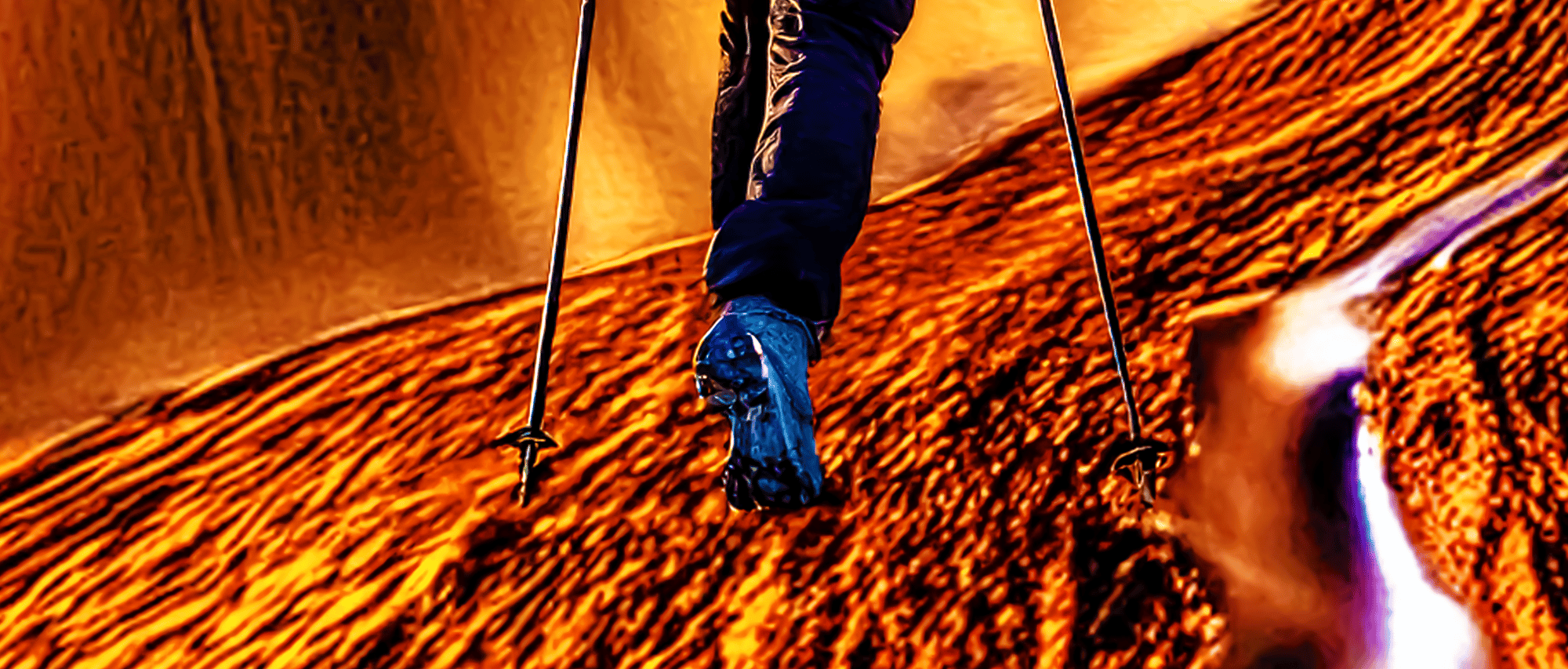 PILGRIMS PATH: Ah, this image vibrates with the tremors of a distorted reality, a breathtaking fever dream unfurling before our eyes. The lone figure, a pilgrim enshrouded in earthly blue, embarks on a journey that is both literal and metaphysical, a quest not merely through nature but through the labyrinth of the subconscious. The path beneath the feet twists sinuously, writhing like a living serpent—a symbol of transformation, temptation, and the eternal flux of existence.