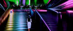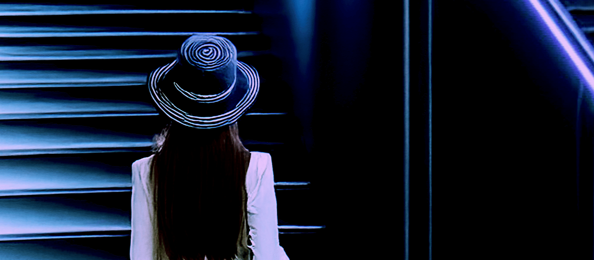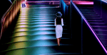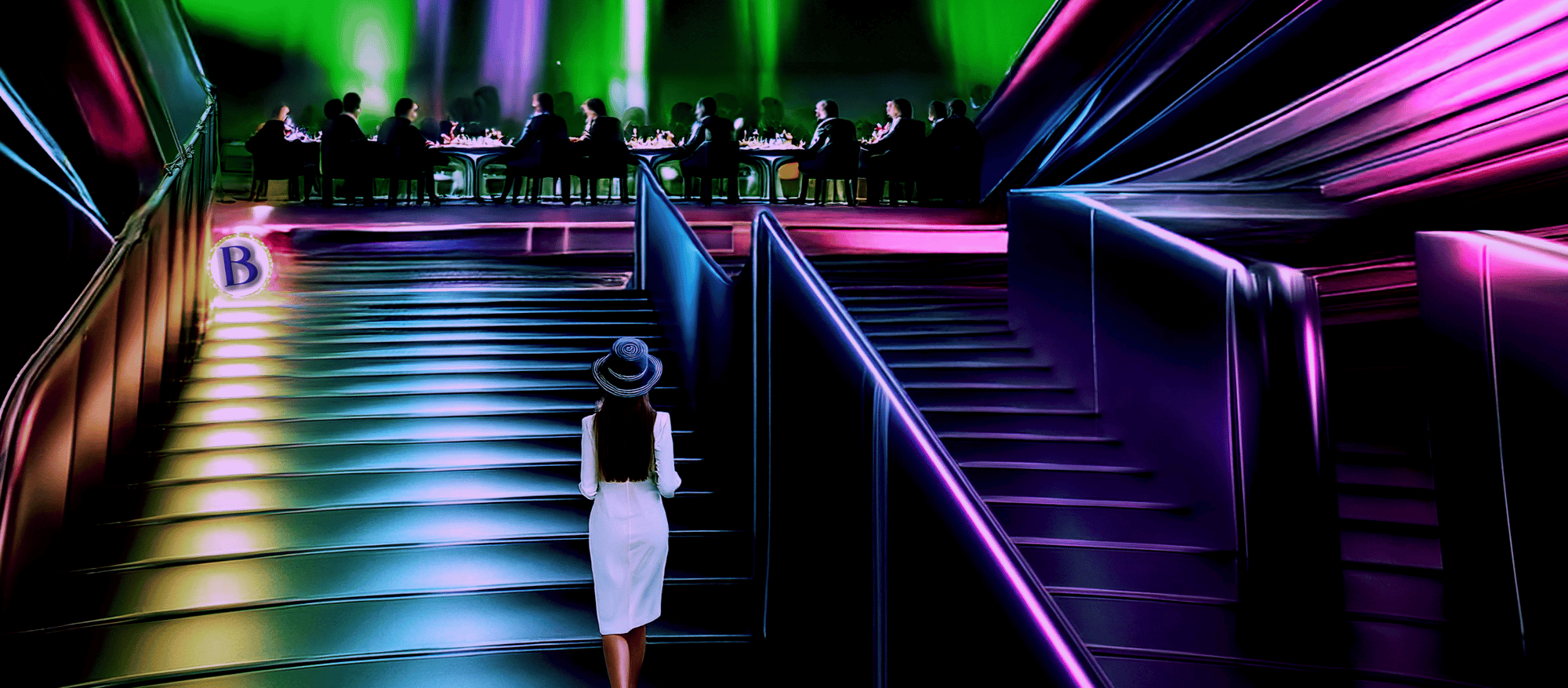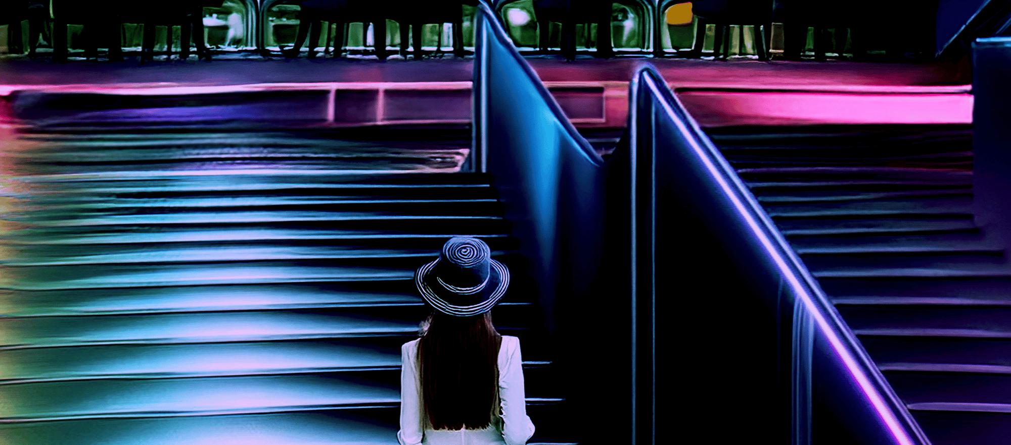 The neon-lit stairway acts as a modern ritual path — a transition from the grounded world to the extraordinary. The lonely figure in white introduces a strong emotional anchor, symbolizing aspiration, introspection and the personal journey toward something greater.