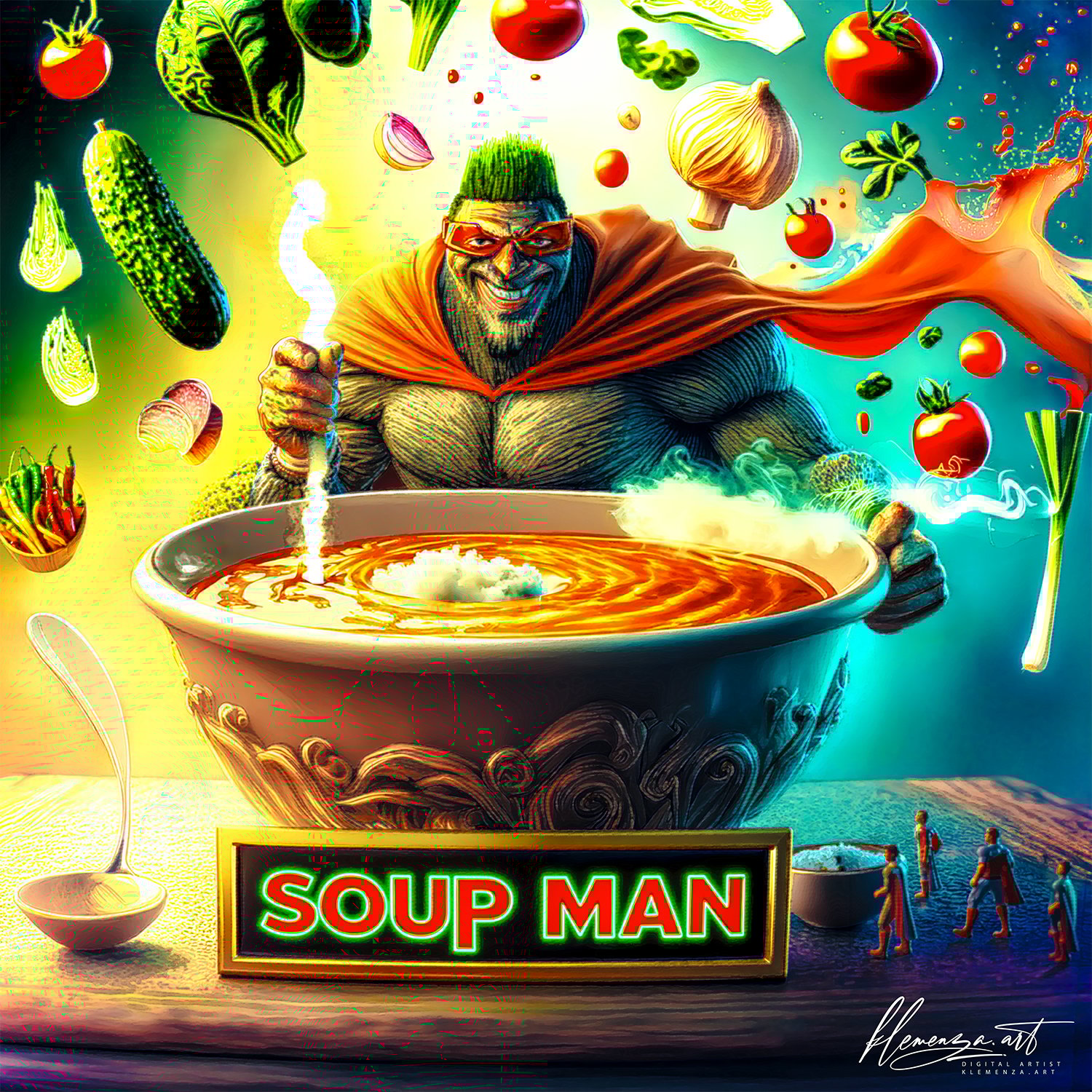 The Narrative Friction: In a world of synthetic comfort and fast-food decay, one hero remains standing by the cauldron. SOUP MAN is the ultimate guardian of the human engine. Using a high-octane blend of spinach, tomatoes, and mushrooms, he brews the antidote to the modern malaise. Look closely at the table: even the "traditional" superheroes are standing in line, waiting for their dose of real vitamins and minerals. This is not just soup; it is a tactical deployment of health. From the schools in Cannes to the kindergartens of the world, SOUP MAN is on a mission to replace the hamburger with the haptic grit of real nutrients.