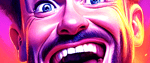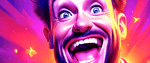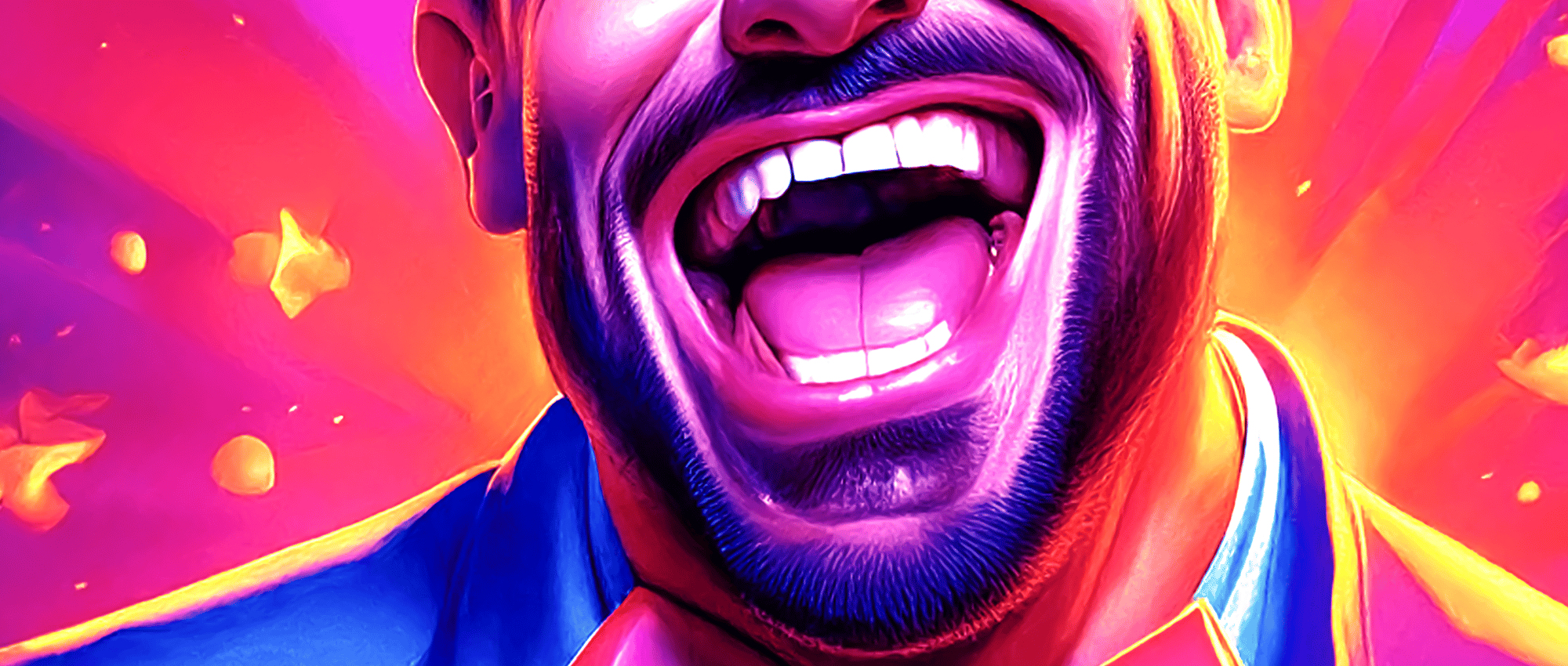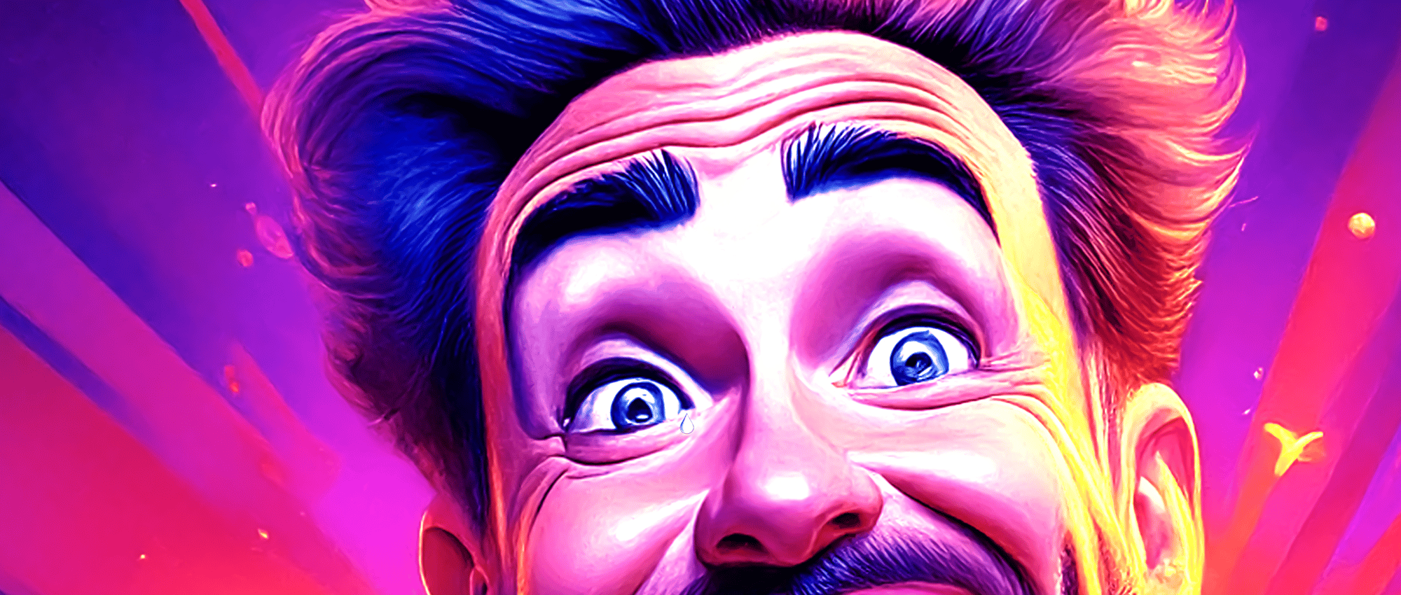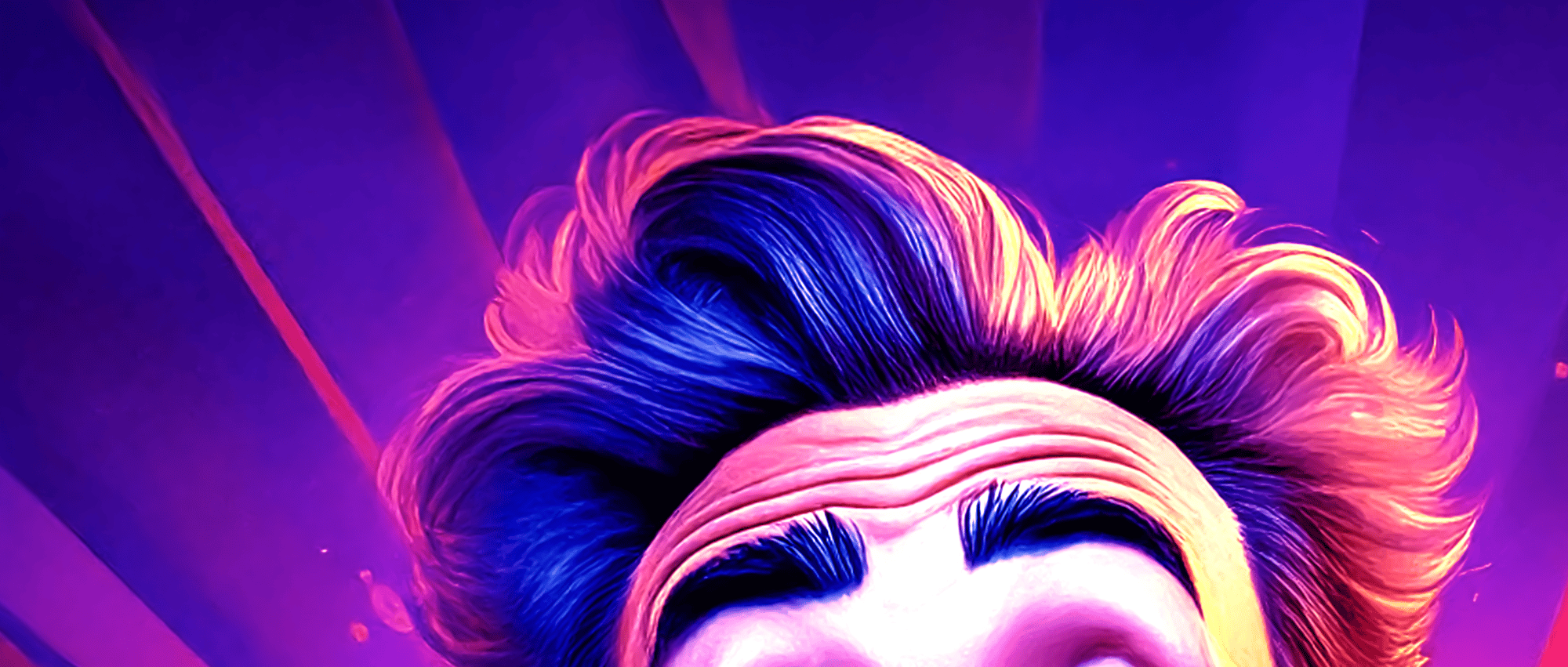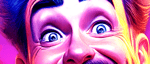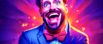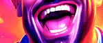 The work’s electric palette amplifies this tension: hot purples and oranges pulse like stage lights, while the fixed grin reveals both resilience and fragility. It’s a tribute to every artist who keeps performing when the applause fades — standing tall, but trembling inside.