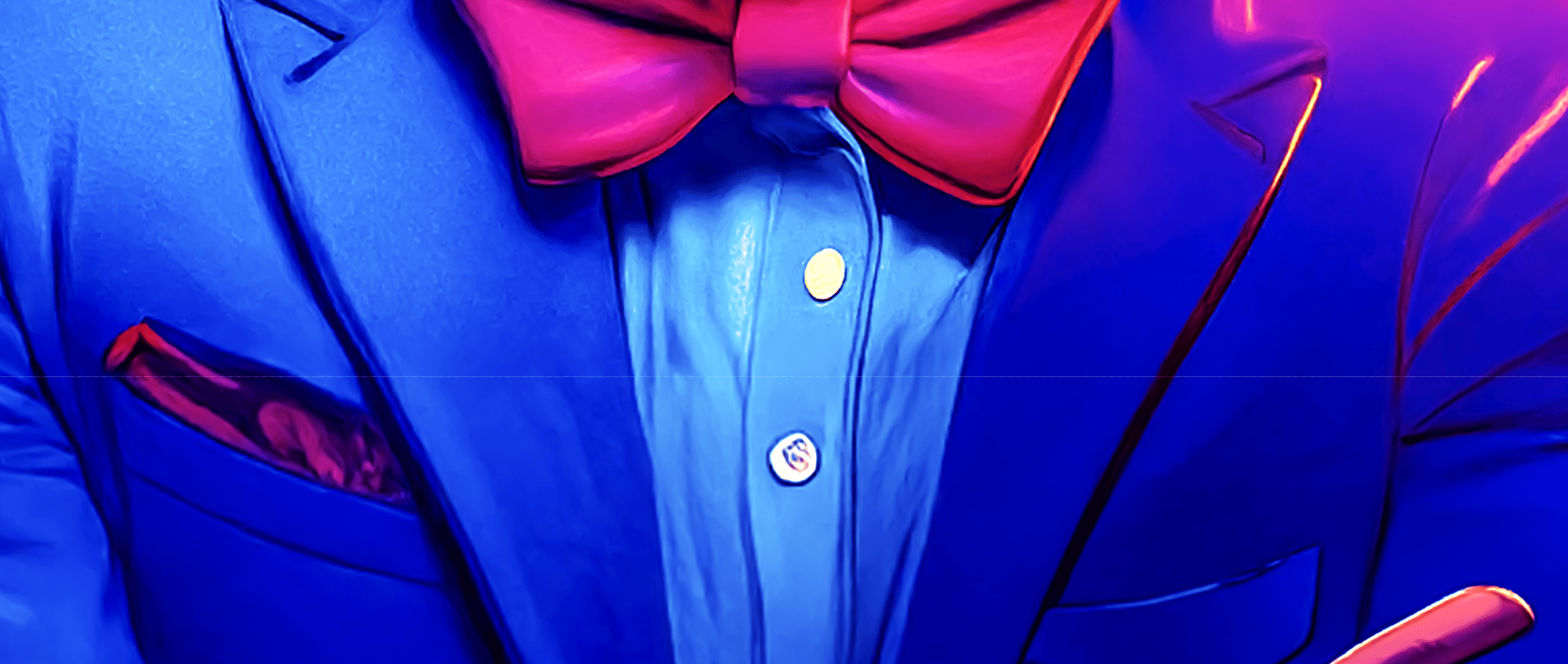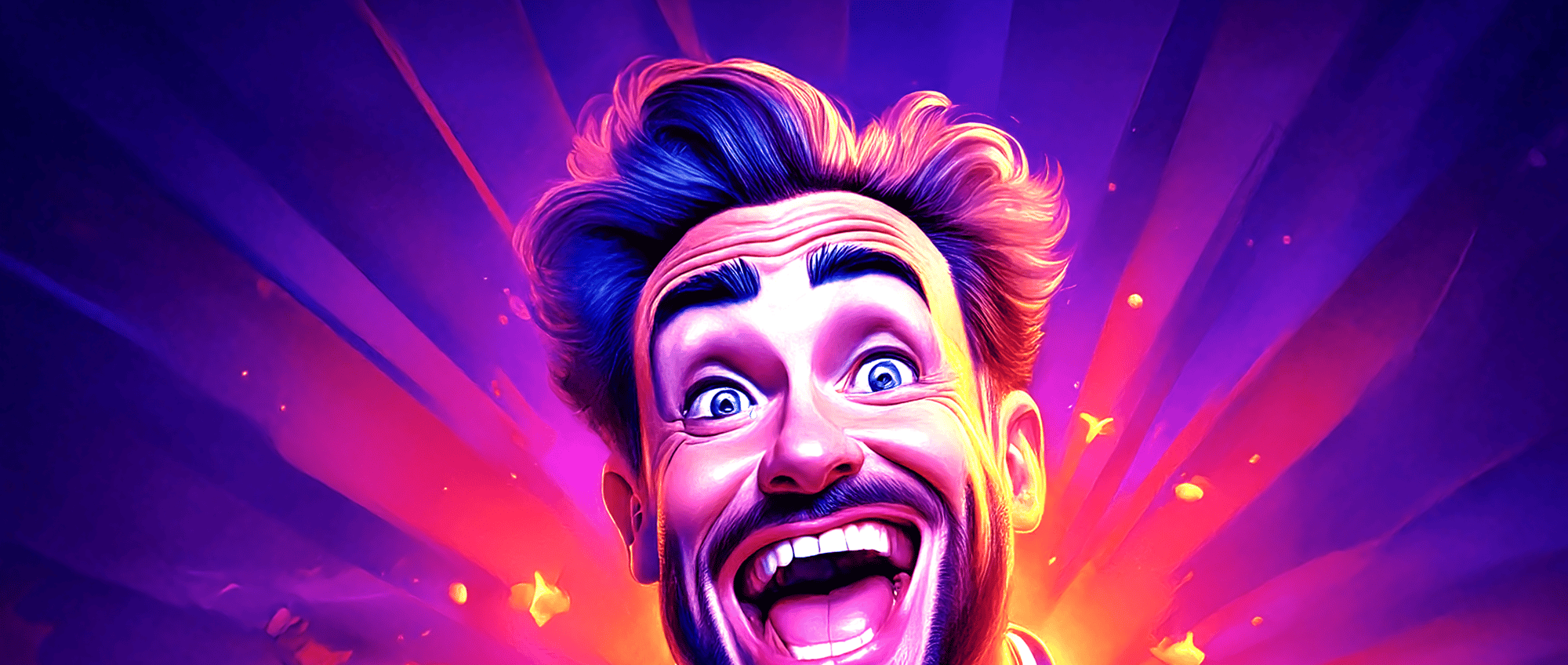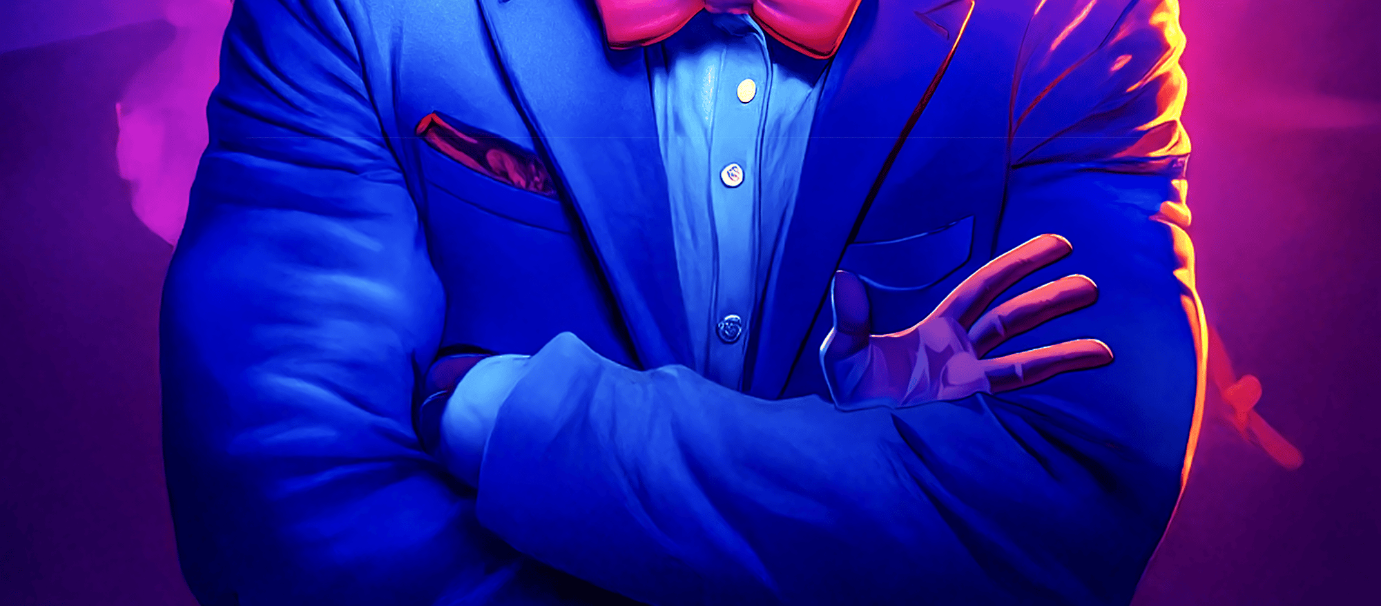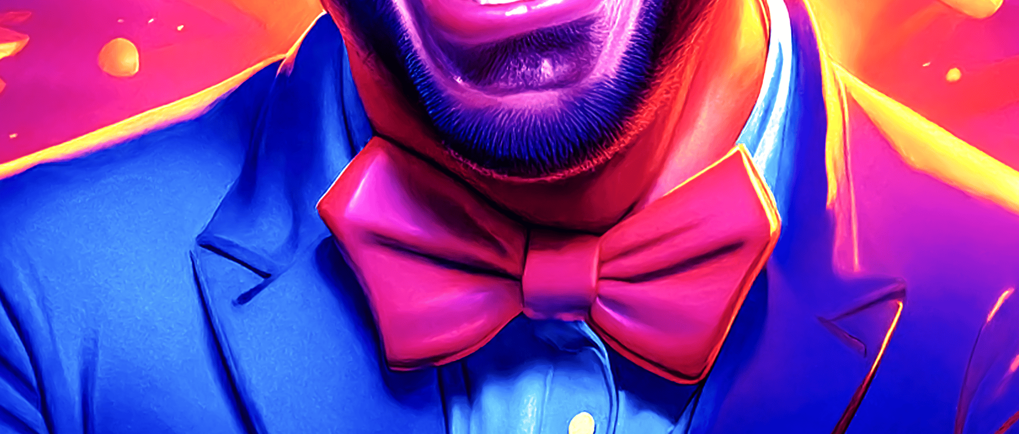 The work’s electric palette amplifies this tension: hot purples and oranges pulse like stage lights, while the fixed grin reveals both resilience and fragility. It’s a tribute to every artist who keeps performing when the applause fades — standing tall, but trembling inside.