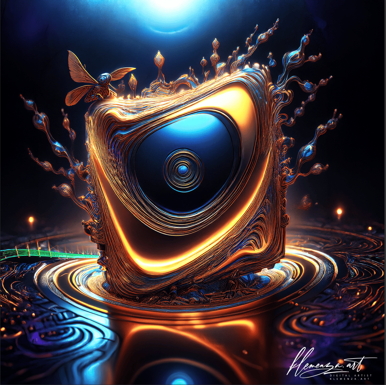 The Visual Impact: The molten gold folds and hypnotic cobalt core create a seductive trap. It is a techno-organic hybrid that captures the exact moment surveillance becomes indistinguishable from nature.