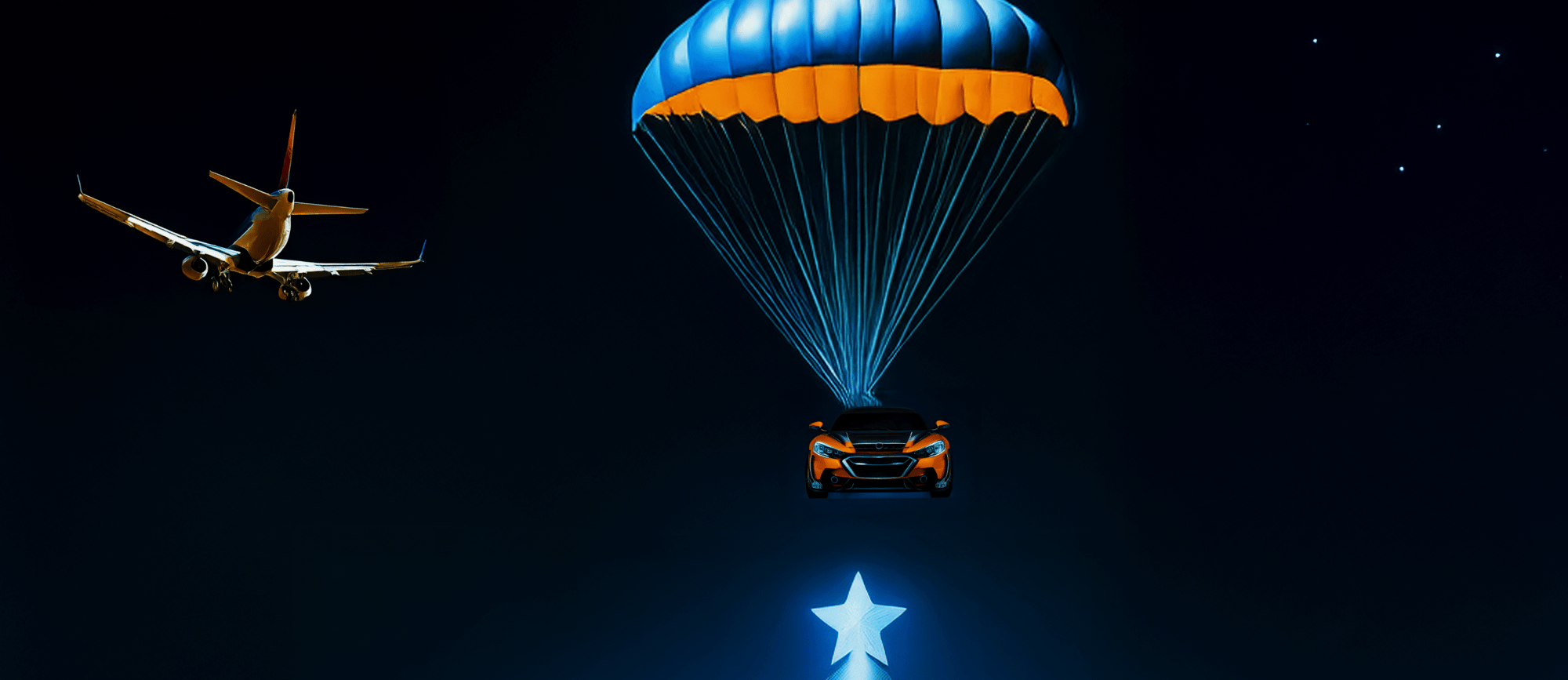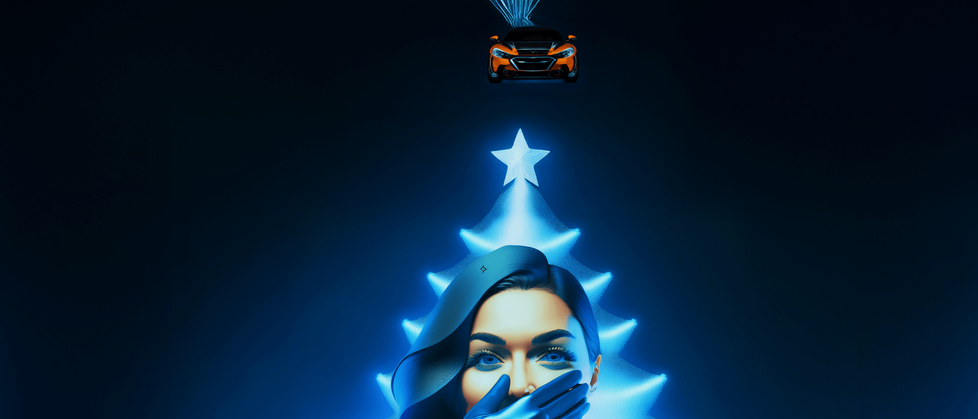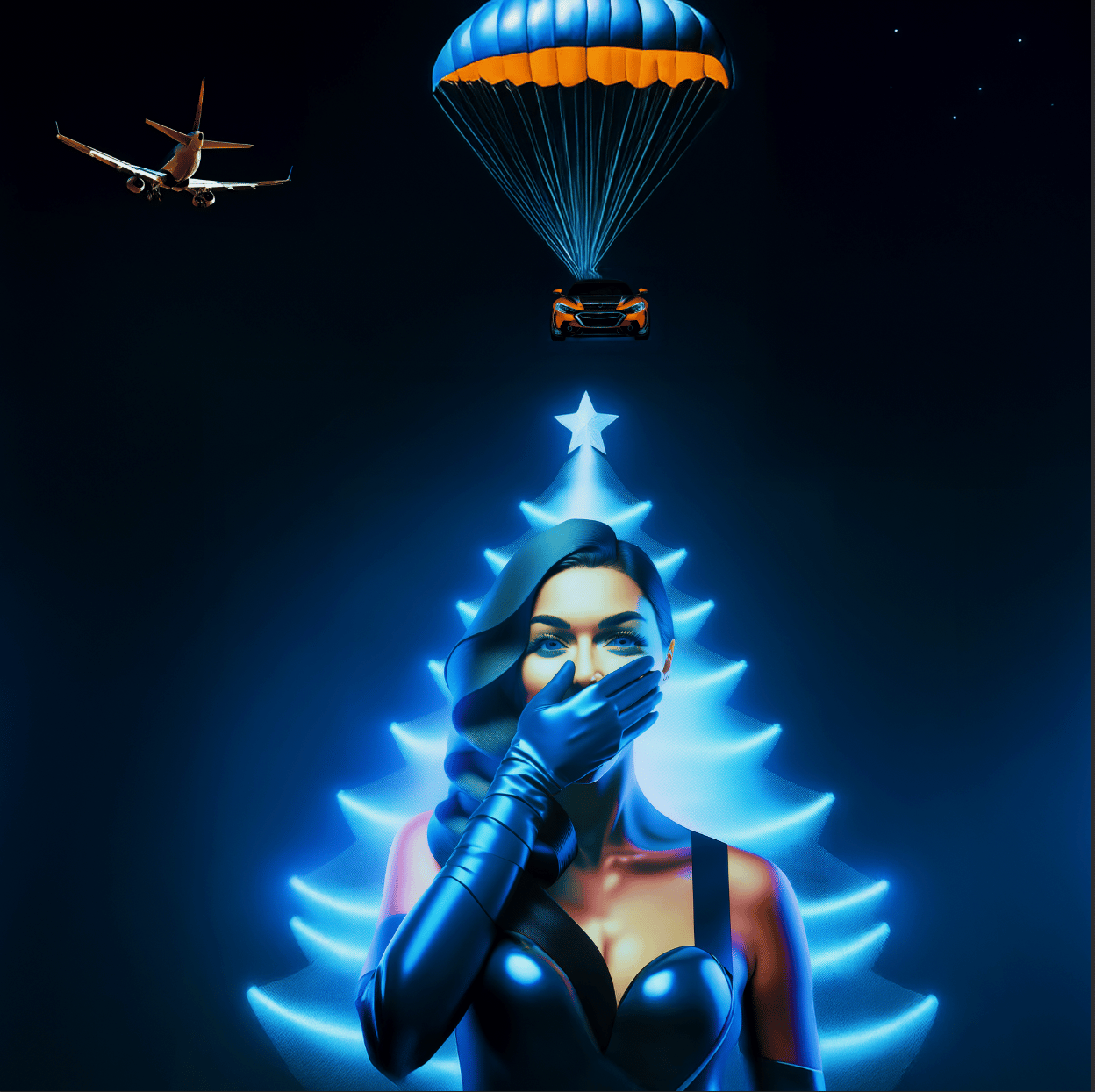 "In this surreal scene, the spirit of Christmas collides with the darkness of corruption and greed. Miriam, a privileged woman in a Middle Eastern war-torn region, celebrates the holidays almost every night—without regard for the suffering around her. As her husband drops luxury goods, including sports cars, from a plane, the image of the glowing Christmas tree contrasts sharply with her secretive and anxious expression. A parachuting car adds to the absurdity and surrealism of the moment, as the juxtaposition of opulence against the backdrop of war and poverty challenges our understanding of morality and excess."